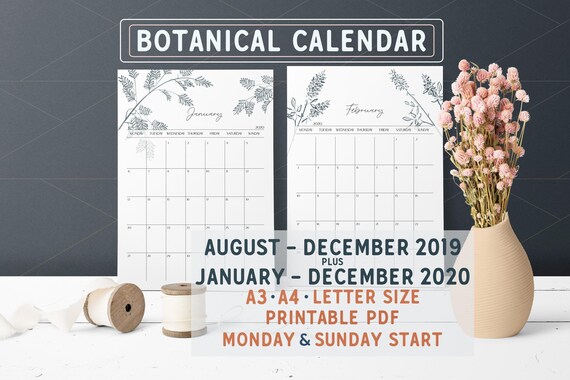 Calendar 2019 2020 Printable Calendar Watercolor Flowers Etsy