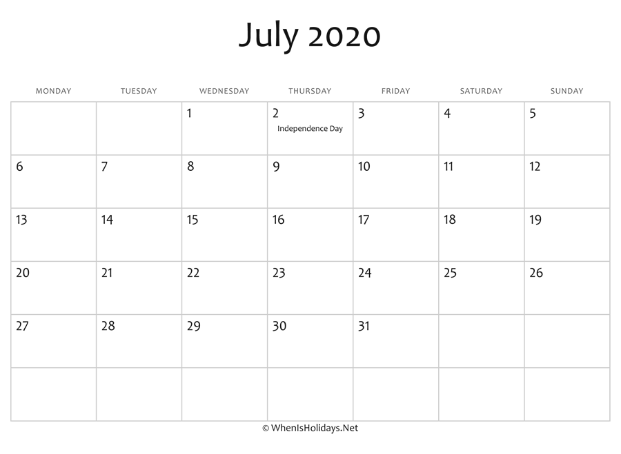 July 2020 Printable Calendar Template Pdf Word Excel