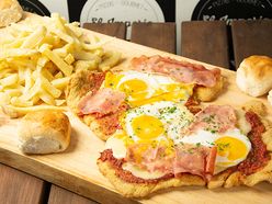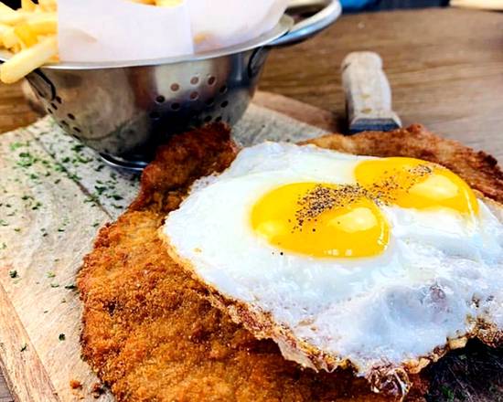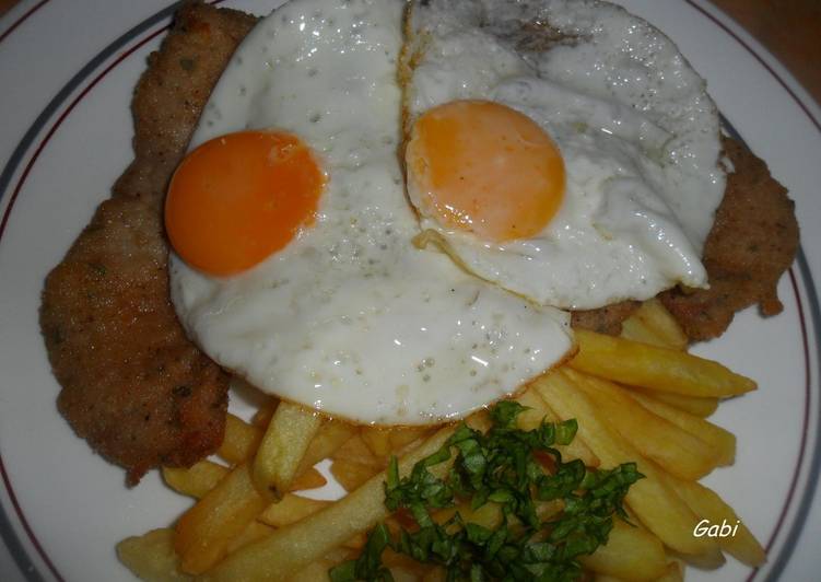 Milanesa napolitana a caballo. The milanesa has many variations. Milanesa napolitana a caballo. Milanesa a caballo argentinian milanesa on horseback introduced to south america by italian immigrants milanesa is a large slice of beef or chicken veal or even cod pounded thin coated in breadcrumbs and fried or sometimes baked until golden.