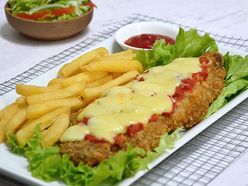 Milanesa carne napolitana con papas fritas 4 raciones lomo nalga para milanesa huevos ajo perejil sal pimienta a gusto pan rallado queso fresco tomate triturado.