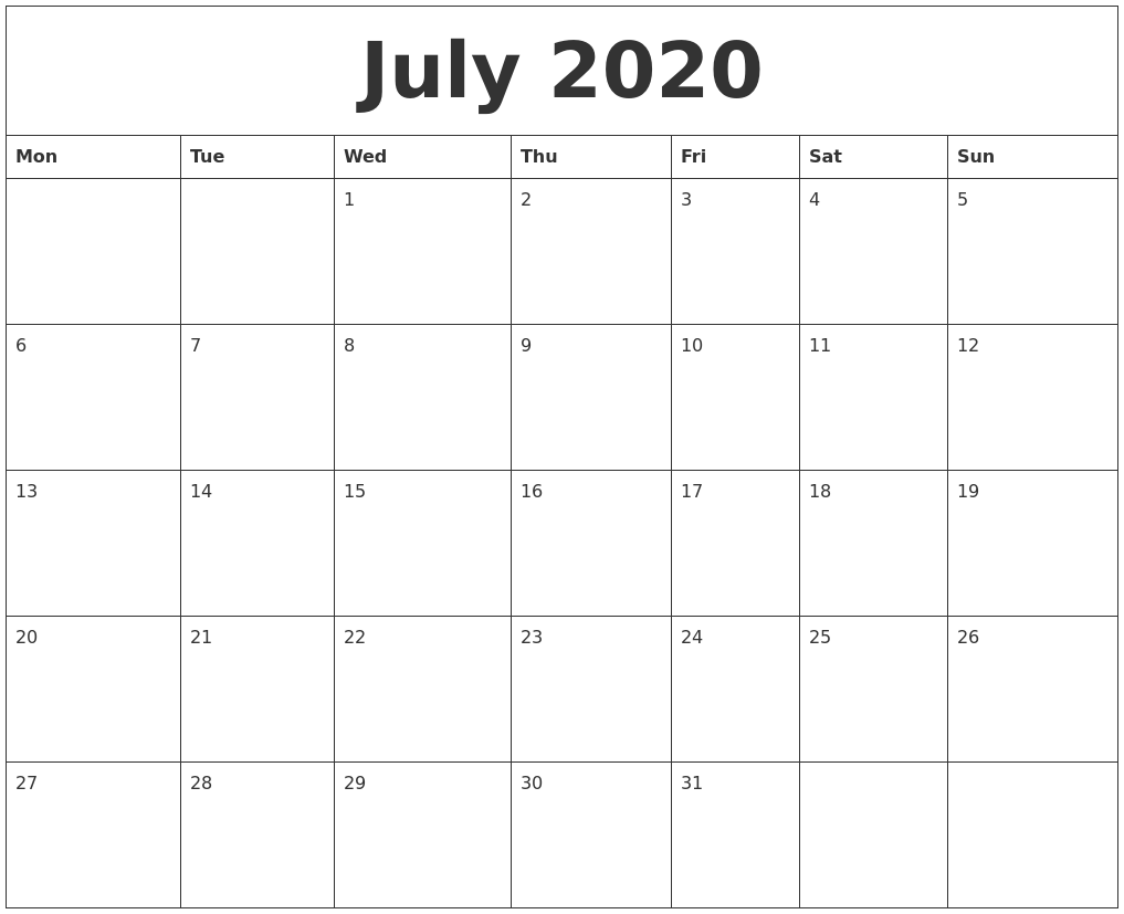 July 2020 Calendar Free Printable Monthly Calendars